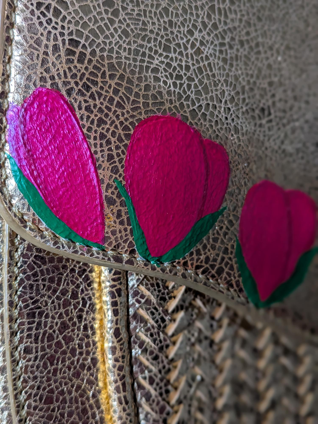 Tulipes dorées est un sac bandoulière peint à la main. Un motif doux sur un sac fort, qui en fait une pièce unique.
